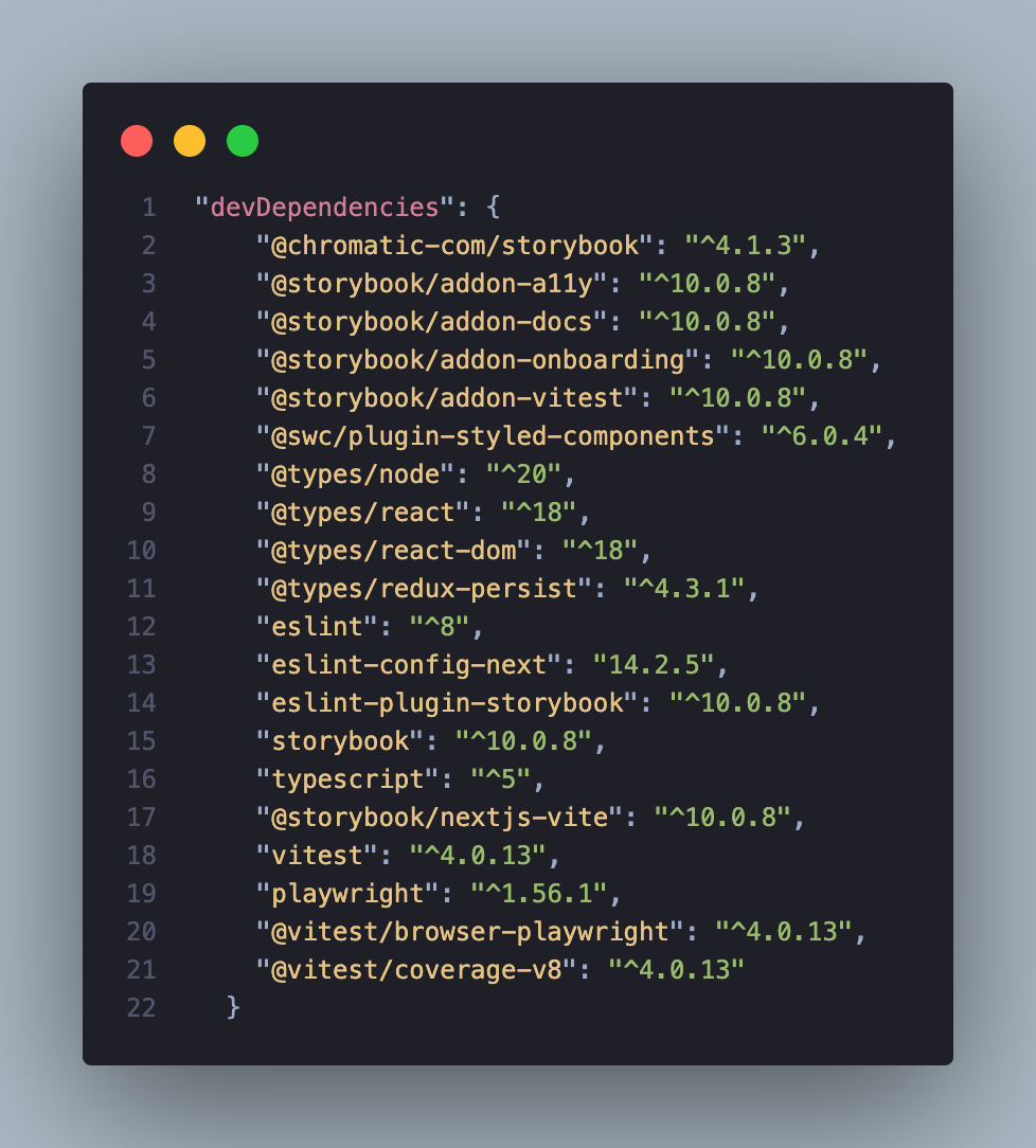 package.json package.json 파일을 확인하니 Storybook을 위한 코어 패키지, 애드온 등을 잘 설치했다.